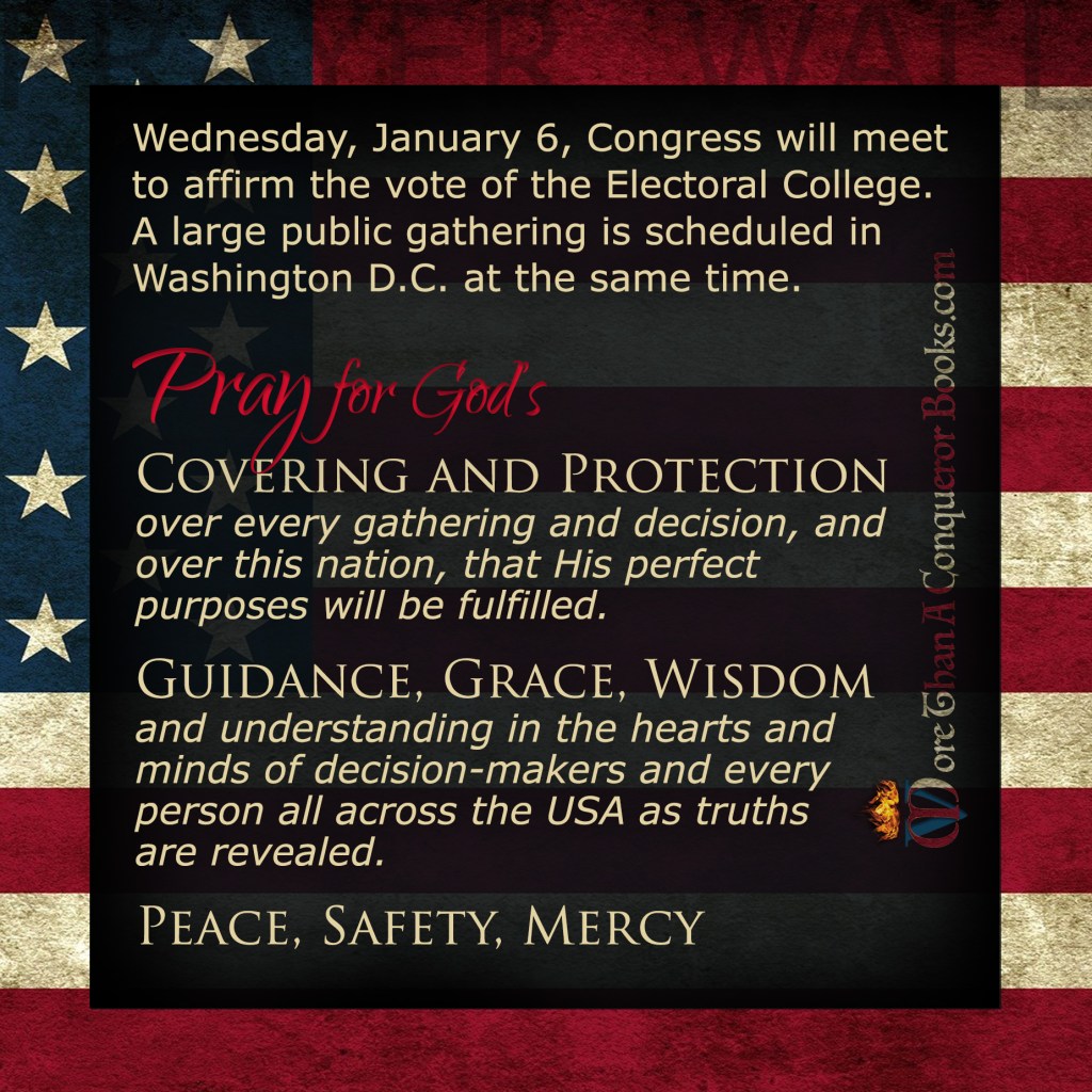 “Heavenly Father, You are the Source of our confidence in all things. You have set a plan in place for this nation and You alone know its future…. As we witness the many things that will happen this week, we ask for Your mercy upon our nation. Be the Guide for Your people and keep hearts open to Your leading as decisions are made that will impact our lives and country. Imprint Your will upon us as we pray for our leaders, over the pandemic, about jobs, about divisions within our government, and more. Holy Spirit, intercede for us when we don’t have any more words and we open ourselves to Your will. Thank you for hearing us and never forsaking us as we ask in Jesus’ Holy Name, Amen.”