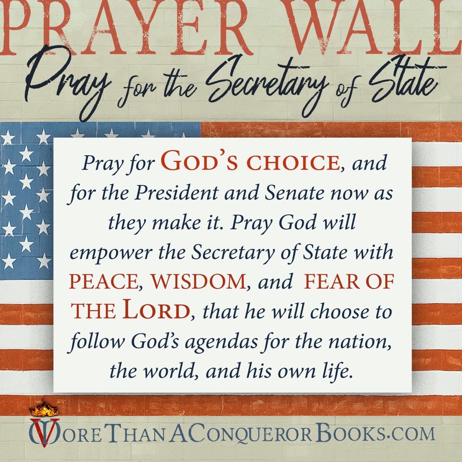 “Dear God, the position of Secretary of State in the new administration is so critical in these days. Foreign policies can draw us closer to our allies and create stability, or it can increase international tensions and harm decades-long partnerships around the world. We pray for the president as he looks to fill this role and we ask that Your will would be accomplished through whoever takes this seat. Guide the Senate as they review the appointee and give them discernment in their decision. Father as the God of Peace, use this person to help calm America’s fears through a calm and steady spirit. We ask in Jesus’ Name, Amen.”