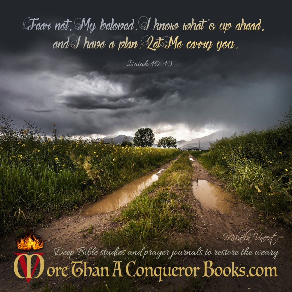 “I have a plan through this. I know you can’t see around the other bend, and what you think might be waiting for you there scares you. But trust Me. I know what I’m doing. I know what’s up there ahead. And around the next bend. And the next. I have a plan to see you through it all, and it is good. For I am Good. I haven’t promised you an easy life, but I have promised to carry you, to love you, to never leave you or forsake you, and to draw you all the closer to Myself through the troubles you face. I’m preparing you for something so much greater. There are ways you will shine for Me no one else will be able to do. There are miracles I want to do in you and through you and all around you. But first, be still. Crawl up into My lap. Lay your head against My chest. Listen to the rhythm of my heartbeat of love for you. Feel My arms around you, and let Me lift you now. Let me stand up and walk out into your trial carrying you in My arms. They can see Me, you know. They see Me carrying you. When you let Me. But it’s your choice. You can worry, take things into your own hands, try to force the outcome you want, snap at the people you love, bury your face under the covers in depression and fear. Or you can soar over this on eagles’ wings, waiting on Me, hoping in Me, trusting in Me, and held by Me. Your choice. And no matter which way you choose, remember … I love you.” Isaiah 40. Deep Bible studies and prayer journals to restore the weary MoreThanAConquerorBooks.com.