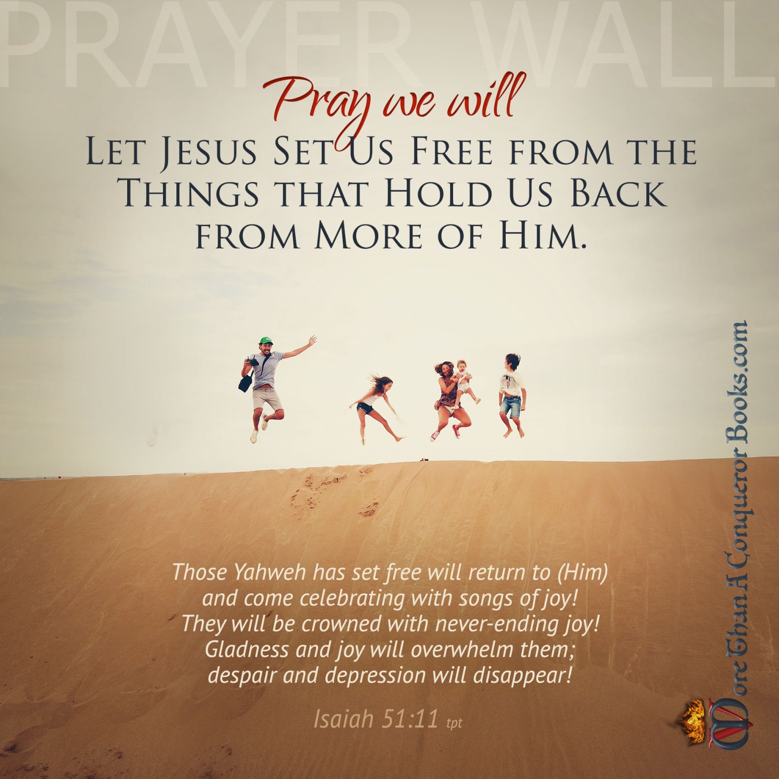 Let’s band together in prayer and build a wall of prayer to block the enemy’s plans, and bring forth God’s purposes in this nation and in the world. “For we are not contending against flesh and blood, but against the principalities, against the powers, against the world rulers of this present darkness, against the spiritual hosts of wickedness in the heavenly places.” Ephesians 6:1 rsv. Join the Prayer Wall at https://prayerwallforthenationandtheworld.wordpress.com. Pray God will set us free from the things that hold us back from more of Him.