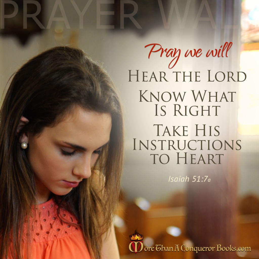 Let’s band together in prayer and build a wall of prayer to block the enemy’s plans, and bring forth God’s purposes in this nation and in the world. “For we are not contending against flesh and blood, but against the principalities, against the powers, against the world rulers of this present darkness, against the spiritual hosts of wickedness in the heavenly places.” Ephesians 6:1 rsv