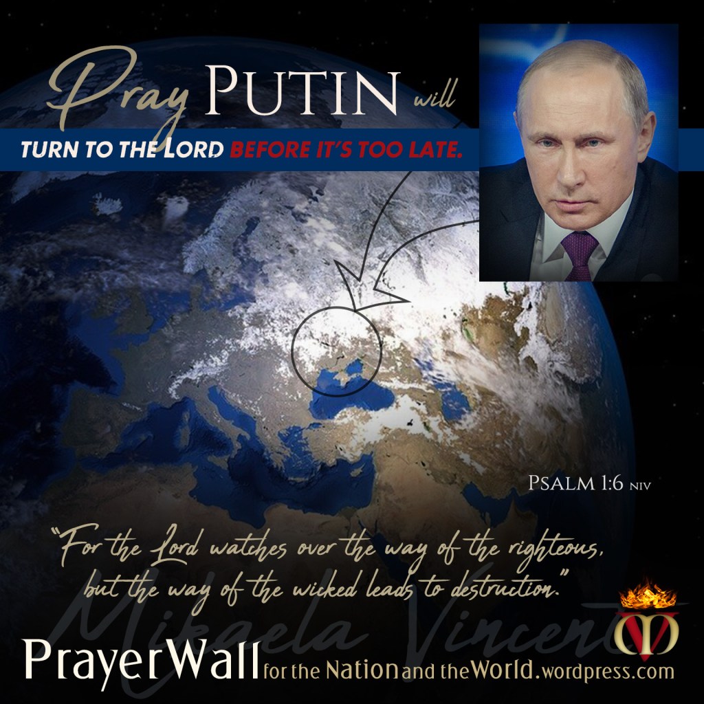 this is what i have for vlad . i consider this a fantastic opportunity to free vlad and line him up with the kingdom to get his needs met . to pray more effectively for vlad i feel we have to have a heart of love and compassion for him so we can see beyond his acting out (in a worldly and fleshly way) competitive spirit against other people with a mentality mindset of “i win you lose”.vlad’s just doing it on an international scale and using an army . to get his will met at other people’s expense . “it’s nearly a case of love the unlovely” and pray for those that use and abuse you. so god i believe you’re going to open up vlad’s mind and spirit/heart to see your way to get his needs met in a kingdom way where everybody benefits . give him the determination and courage to be a world revolutionary in this way to bring kingdom solutions to high level government. and help him take the bit between his teeth and jump into a faith solution. also vlad with his acting out has been a huge stumbling block to people who’ll react and be locked into hatred for what he’s already done . so we pray for them that they get freed from their prison of hatred as well. help people close to vlad that he listens to speak in LOVE and TRUTH to him ,so he can see how he’s been highjacked by the enemy in thought and deed. in jesus’s name amen.