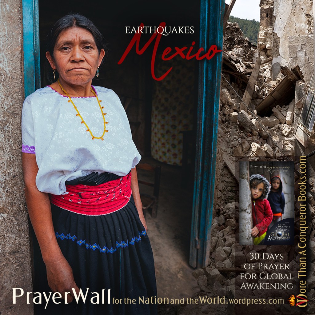 Lord, we thank You for the lives that were spared this week. Please heal the injured and comfort those who mourn. As the country still trembles in the aftershock of so many earthquakes, gather each person up into Your arms and remind them You are good. That You are more powerful than an earthquake or a date or even a demon. Show them Your glory, Lord. Perform miracles and signs and wonders to draw all people to Yourself. Drive each person to their Bibles to look for You, and meet them on the pages. For those who have been deep in sin, draw them to repentance. Awaken Mexico. Compel both the lost and the saved to lay down everything they have run after that isn’t You and to seek You now with all their hearts. Tear down their idols, and set them free to surrender to Your love. Awaken the church to love You with such passion they will spread across the mountains into every village and town to share Your good news with the lost and plant churches. Protect and bless Christians so abundantly they will also bless others around them, demonstrating Your love and protection even as they share Your message of truth. Shine through them such love, joy and peace that everyone who meets them sees it and longs for it and asks them how they came by it, so the Christians will point to Jesus. Tear down the cartels, the drug and human trafficking rings. Arrest those involved in every kind of evil, and block them from those evil plans. Destroy hatred, pride, greed and self-seeking. Stop the kidnapping, extortion, violence and murder, and release those held prisoner for evil purposes. Give every heart in Mexico a hunger and thirst for You, and then satisfy them with the Living Waters of Your love. Psalm 42.