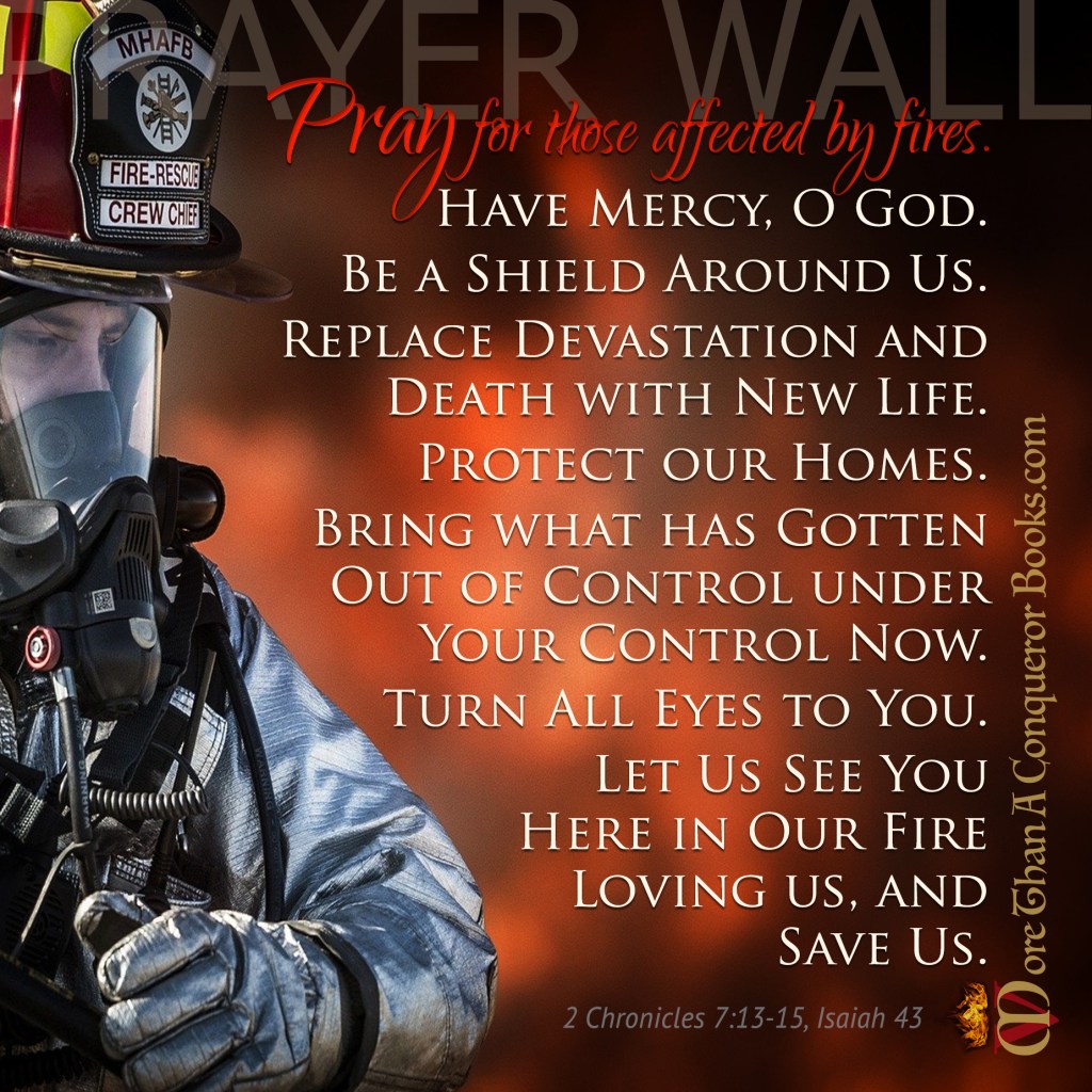 We ask You, Lord, for those facing fires right now. Give firefighters courage, wisdom, strength, and Your covering and protection as they battle the blaze. Meet them in the midst of the fire, show them the way to go and how to stop the spread, and please, Lord, bring rain. Shield people, homes, businesses, livestock, properties, forests, and wildlife. Provide the way of escape for those who are trapped. When we call to You, hear us, O God, and answer. Lord, so many across the world have lost homes and loved ones due to fire and other devastation. Please meet them in their sorrow and desperation, comfort them like only You can, and show them You are the God they are looking for. Provide for all their needs, and do it in a way that they know it was You, so they will place their faith in the only One who can truly help and heal them now. Be our Shield, our Comforter, our Home, not just in these physical fires but in the fiery trials we now face. For we have wandered far from You, and now it seems as if the things we trusted in are going up in flames. We need You, Lord. Here in the midst of the fire, let us see You with us, holding out Your arms full of grace, ready to save. Set us free from all that has consumed us that is not You. Change our minds, transform our hearts, and revive us, O Lord. Consume us with desire for You alone. For only when we are held in Your everlasting arms will we truly be safe. In Your name. Amen.
