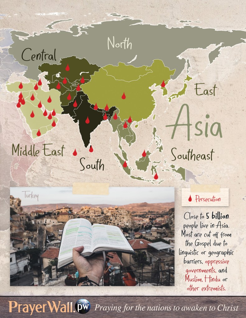 Lord, almost 870 million Muslims are scattered throughout Asian countries. As they fast for Ramadan, seeking to know You in powerful ways, answer their heart’s cry. Come and meet them in their dreams. Show them who You truly are. Jesus, stand before them in visions, telling them Your way of salvation. Where imams reach for the Quran, hand them a Bible instead and open it to just the passage they need to read to at last understand Your sacrifice. Bring Muslims to You by the millions all across the Middle East, the Stans, South Asia, East Asia, Southeast Asia, and even in Russia. Great and mighty God, Christians are violently persecuted in most of these countries by Muslims. Please shelter Your followers from harm, and turn back every evildoer. In fact, turn them completely around. To choose You.