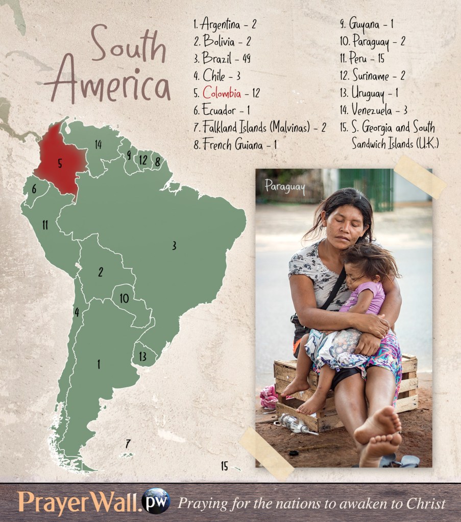 Lord, we thank You for the many believers in this region. Please grow Your church strong in faith, love and witness. Raise up youth who will defy current cultural trends and choose purity, integrity, Christ-like love and truth instead. In the midst of much economic upheaval, bless faithful believers so abundantly others will take notice and seek You. Give the lost such a hunger for You they drop their worldly pursuits and choose You as their one passion. Give pastors and other Christian leaders courage to remain faithful to their wives and raise their children up in love. Wherever there is syncretism, infighting or nominalism, cleanse Your church, O God. Bring Your people back to what matters most. Be a Shield around Christians in danger. Comfort and encourage them to stand strong and loving in the face of opposition. Overcome the darkness all around them with Your light in them. Bring down the cartels. Open the eyes of those bent on evil to see Your hand protecting the innocent, so they will fall to their knees in fear of the Lord and surrender to You. Raise up Christians who will lead their nations to walk in righteousness, integrity and freedom. Lord, in this region are tribes untouched by outsiders. Their numbers and languages are yet unknown, and missionaries are forbidden. But You know them, Lord. Reach into every tribe, language and heart with Your Good News. Heal the sick, save the lost, and awaken all of South America to Your truth and light. Call out prayer warriors and missionaries who will join together with You to reach every heart and nation with Your love.