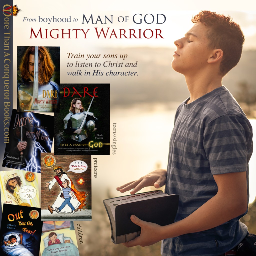 For deep devotional Bible studies for your teen and single sons, see Dare to Be a Man of God and the accompanying Dare to Be a Man of God Prayer Journal. For ages 10-13, see Dare to Become a Man of God at MoreThanAConquerorBooks.com.