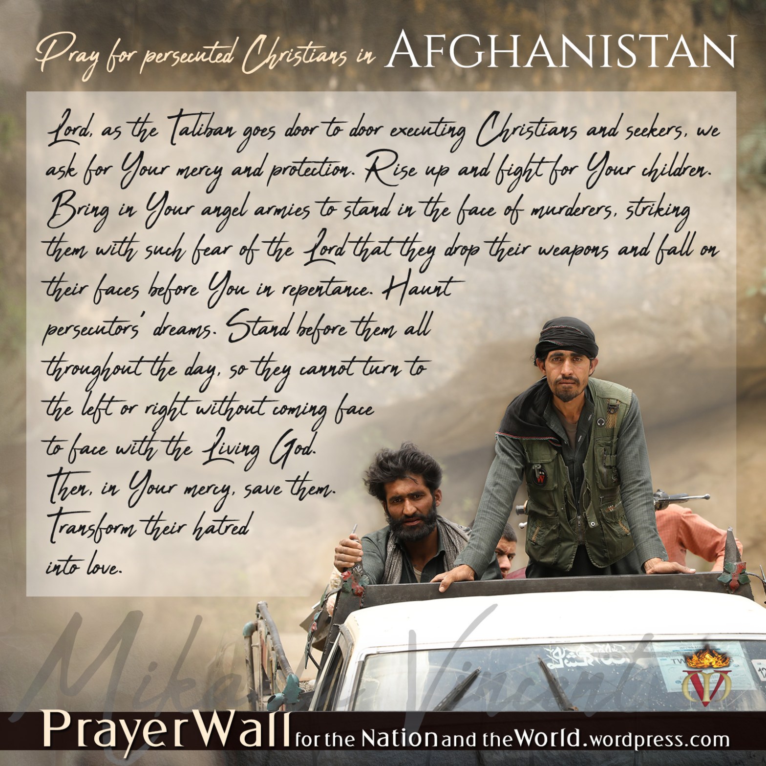 Father, as the resurgent Taliban in Afghanistan goes door-to-door executing Christians who will not renounce their faith, please rise up and fight for Your children. Surround every believer with Your angels. Push back evil, and bring forth good. Block every attempt of violent people to harm, rape, murder or even come near Your children andContinue reading “Persecution in Afghanistan”